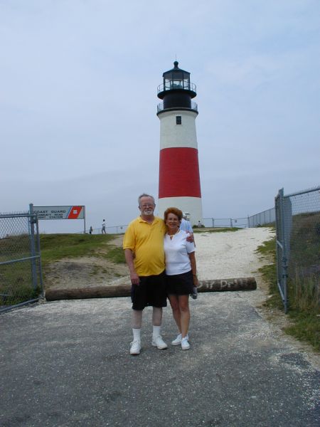 Photo of Pat and Dick standing in front of Sankaty Head light, located on the far eastern end of Nantucket