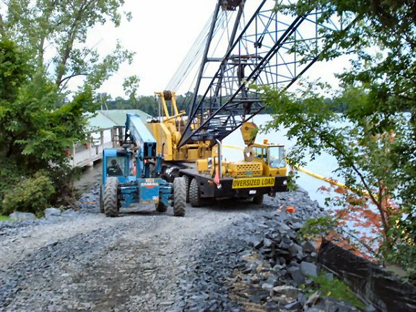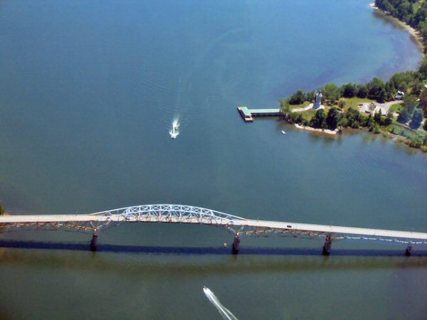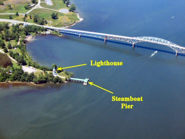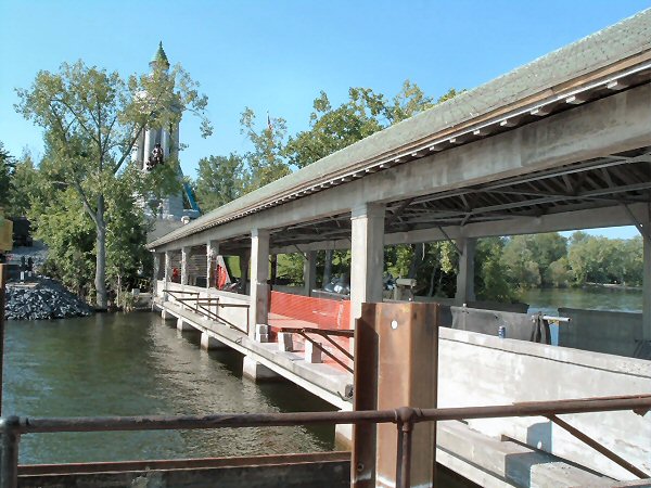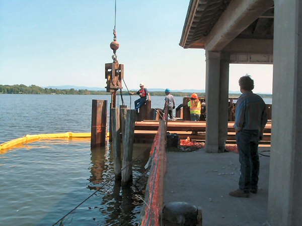 An aerial view of the Lake Champlain Bridge and Crown Point Pier and Lighthouse, taken on a father's day flight by Randy Vogt in 2008. Under Governor Pataki, the NY State Environmental Protection Fund was committed to fix the covered pier, make it handicapped accessible and restore the lighthouse for the Lake Champlain/Hudson River Quadricentennial Celebration. Ron bid on the job for his employer DeBrino Caulking Associates. They received the contract and the following pictures are from the ongoing restoration project.