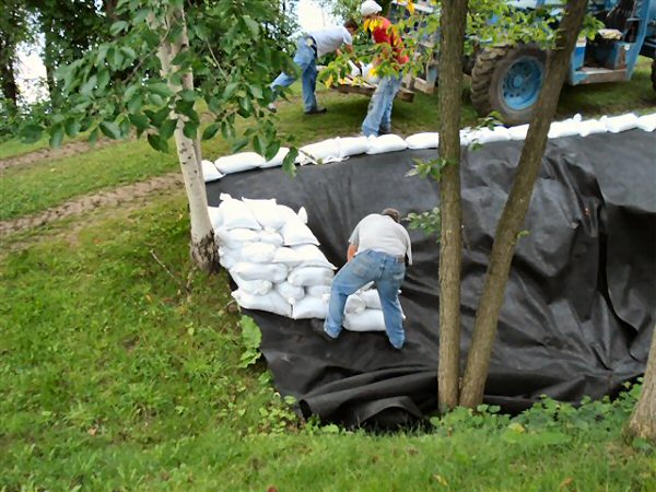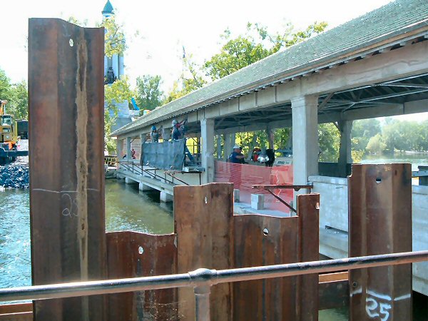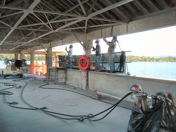 Workers preparing the concrete surfaces and some sheet piling in the foreground.