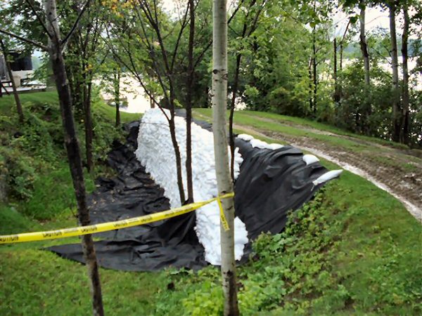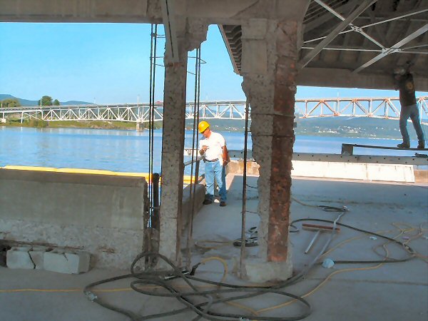 View of the detiorated condition of the concrete. The Lake Champlain bridge is in the background.