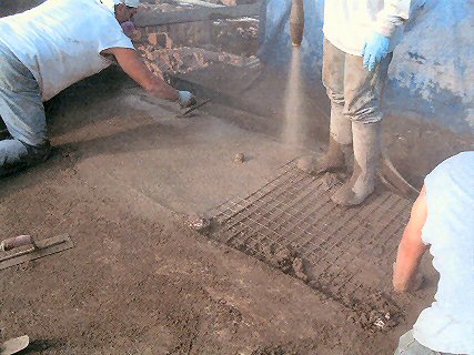 A worker spraying gunite (concrete) while a mason finishes the surface.