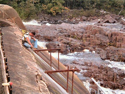 A worker inspecting the dam face just above the special supports installed to support the scaffolding for the job.