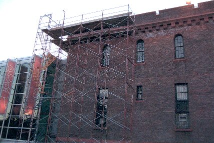 A view of the extensive scaffolding required to repair the solid brick parapet wall atop this RPI building.