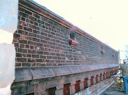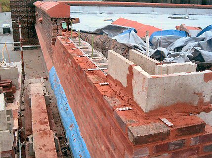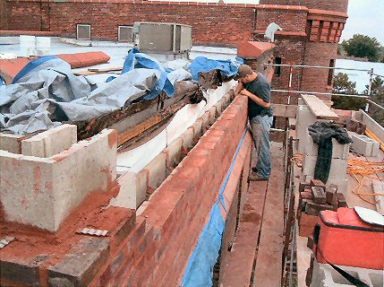 View of the repair in process. Note the original thick, all-brick parapet has been replaced with a modern brick-faced concrete block wall.