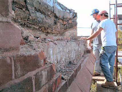 Another view of the restoration work in progress. Note the way the brick and block is tied together with metal strips.