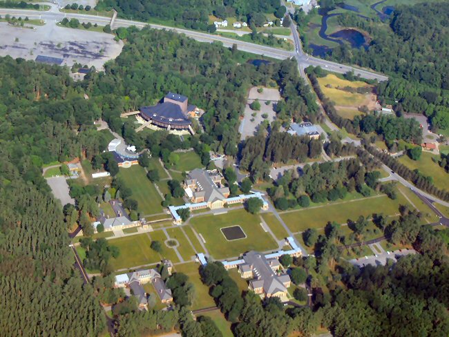 The Saratoga Performing Arts Center from the air. Parking lots are at the upper left, the concert Amphitheatre upper center, and the Hall of Springs in the center.