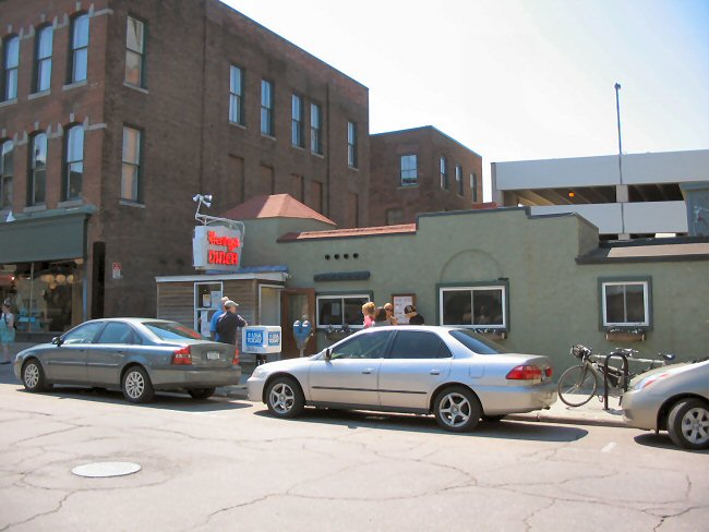 Highly recommended by the airport desk attendant, we proceeded to Henry's Diner in downtown Burlington. While I registered our reservation (they were very busy) Randy proceeded to look for a parking spot. Performing a "U-ee" he found one on the diner's side of the street. They are seen waiting for our table leaning against the USAToday stand.