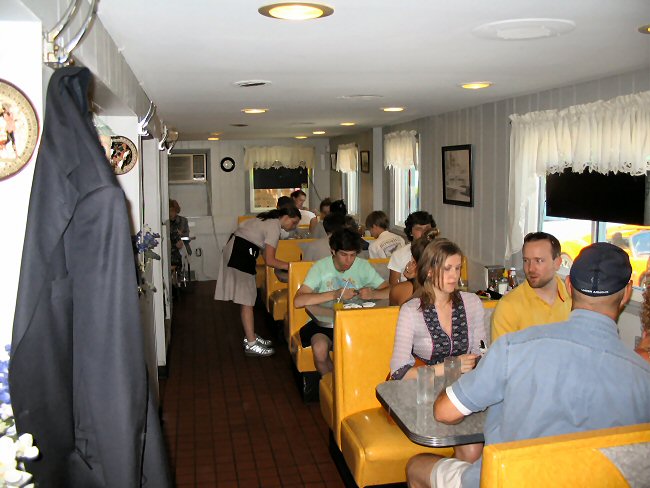View inside the front of the diner from the line at the cash register and exit. Our table was at the end of the turn to the left. The furniture was of the vintage chrome kitchen set era with padded chairs and a formica table top. Our waitress was excellent and we all enjoyed the food.
