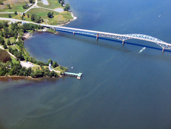 The circular structure behind the pier was a lighthouse (the building attached to it has been removed). The road to the bridge over Lake Champlain is aptly named "Bridge Street". Adjoining the lighthouse is a New York State park and campground.