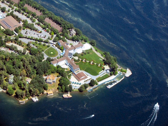 The historic Sagamore Hotel and Lodges on their own 72 acre island. Note the light colored material on the water. All the lakes, on this day, were covered with conifer pollen. You could actually see the tracks of boats on the waters.