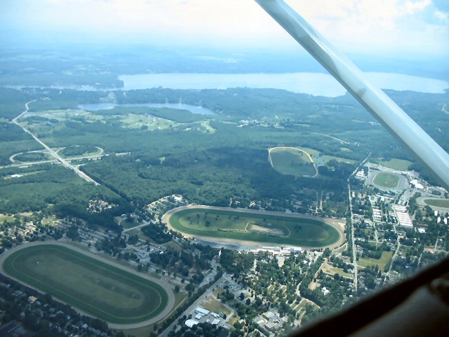 Just below center is the Saratoga Race Track and the grandstand. Saratoga Lake is in the distance.