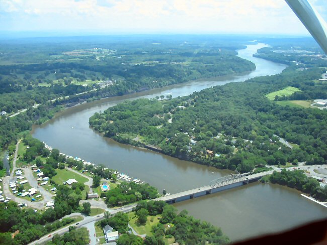 View of the Mohawk River toward the East with the Rexford Bridge in the foreground. The Schenectady Yacht Club facilities are at the left.