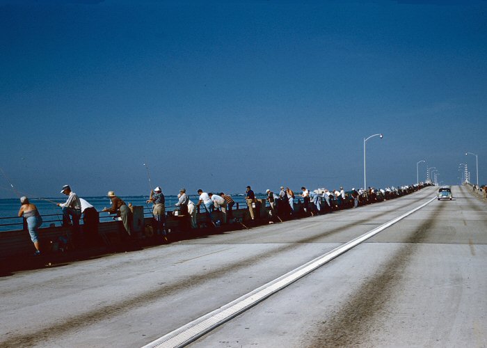 Fishermen (and ladies) lined up on one of the island causeways in Miami (labelled 'Crandon Park Bridge' on the slide).