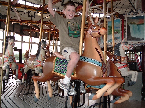 Having a great time riding the carousel. The horses are genuine original carvings that have been restored like new.