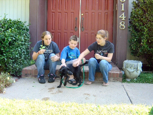 Here I am sitting between my sister Stephanie on the left and my foster sister Amber on the right. We are trying to get my new dog, Summer, to stand still for the photo. This was taken in August 2004 so Summer has grown a lot!