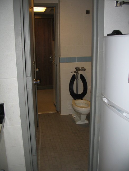Two men share each room and two rooms share the bath in the center. Note the refrigerator in the foreground.