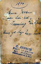 Written in Mother's hand: "My Parents. Martin Ludwig Wilhelm Jenning, Anna born Meier with the dates of birth and death (the "y" and inverted "y" indicating birth and death are an interesting German symbol). The Portrait Photographer, Mr. Jensch, had his studio in the Hamburg waterfront district of St. Pauli.