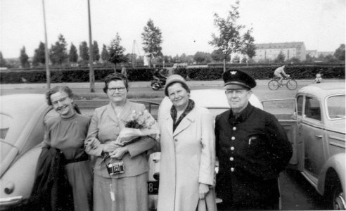 Shortly after the war (in 1947) Mother visited her family in Hamburg. From left to right is Aunt Emma, Mother, Aunt Gretel and Uncle Martin. A larger portrait of Uncle in his transportation uniform is on the right. Mother flew on an SAS flight that showed its wartime background by still having fittings for paratroopers in the airplane.