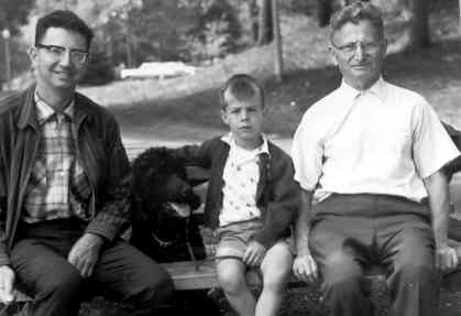 Grandpa, Unk and Randy with our favorite standard poodle, Kerry. As you can see, photographing Kerry on black and white film was not easy. Note the high tech remote control (my hand pulling a string!).