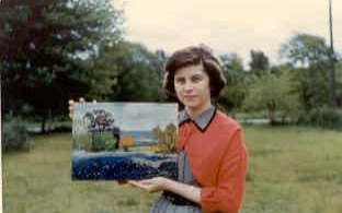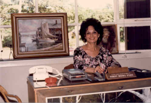 I couldn't leave out Mrs. Robert Brooks who ran an art gallery in Hyannis, MA, another of our "must" vacation stops. She is the wife of the painter of Mom's favorite watercolor of Cape Cod's Sandy Neck. The harbor scene behind her is a Brooks original. I also have an original oil by Mrs. Brooks herself. A side note - Mr. Brooks made two panels on a Biblical theme for the Hyannis Synagogue out of individual glazed tiles. We went to see the actual mosiacs and, if you visit the area, highly recommend stopping in to tour the facility.