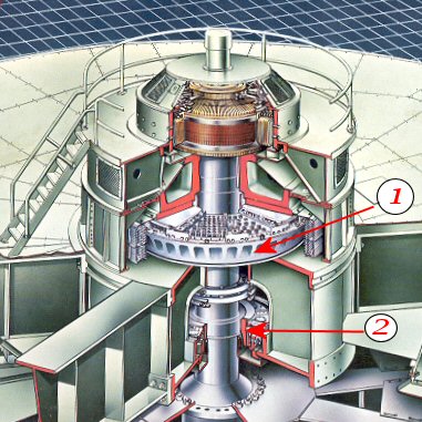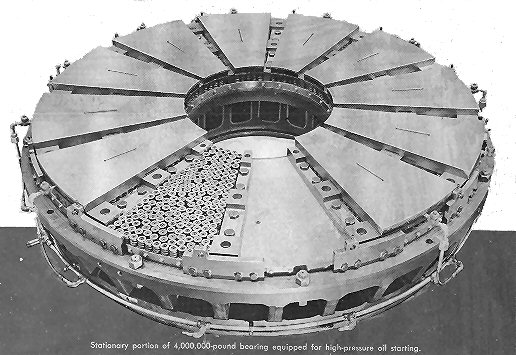 To the left is a cutaway of a typical hydro generator with with the main bearing above the rotor (#1). This is the "spring cage", so-named because of the numerous springs supporting the babbit bearing segments - causing them to "float" and adjust to the "super-finished", very fine polished finish of 5 micro-inch [millionths of an inch], "runner". #2 is the guide bearing also holding babbit segments steadying the rotating shaft. My duties also required me to disassemble these guide bearings, clean all the parts, enlarge the bores in the "test shim" (used to electrically test the insulation value of the segments - leakage would result in erosion of the bearing surfaces), align and re-assemble, fill the bolt holes with epoxy compound and send the support to our boring mills for final machining.Above the spring cage and runner, the very top of the unit, is the exciter: the generator that provides the electrical field for the main generator below.